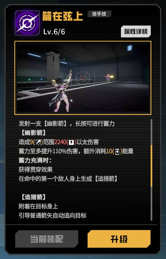 发射一支箭矢照成一定范围的以太伤害,蓄力可以让箭矢提升伤害并贯穿敌人,命中敌人后普攻都会锁定敌人一段时间,后续使用信手技发射的箭矢增加伤害,最多增加两次