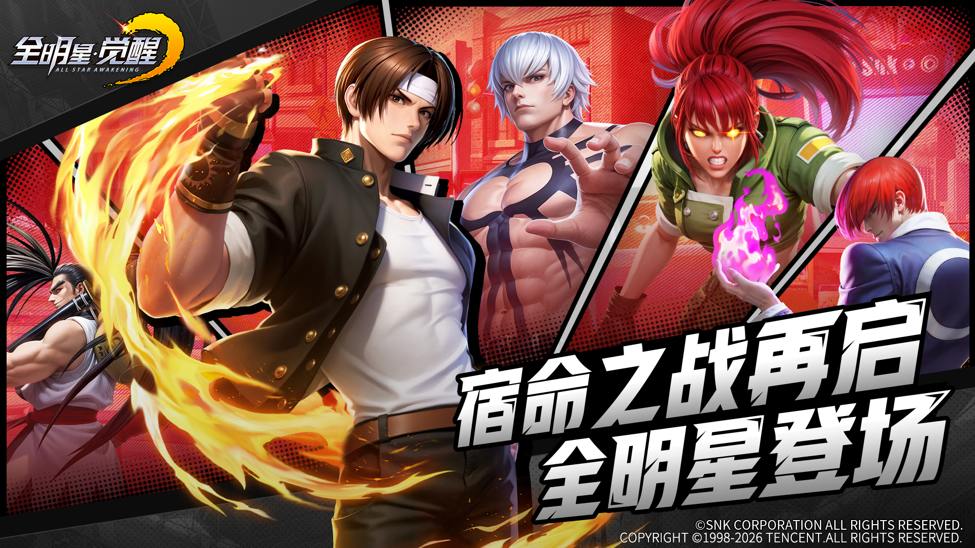 SNK正版授权的街机策略卡牌手游《全明星觉醒》正式定档,将于2026年1月月22日全平台上线!最终倒计时7天,现已启动!八神庵、草薙京、不知火舞、橘右京、娜可露露等50余位SNK经典角色已全员集结,等待你的召唤。