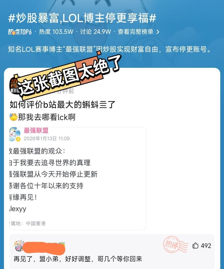 近日,知名英雄联盟赛事解说博主“最强联盟”突然发文宣布账号停止更新。他在发文中表示,自己将“去追寻世界的真理”,并感谢了观众十年以来的支持。