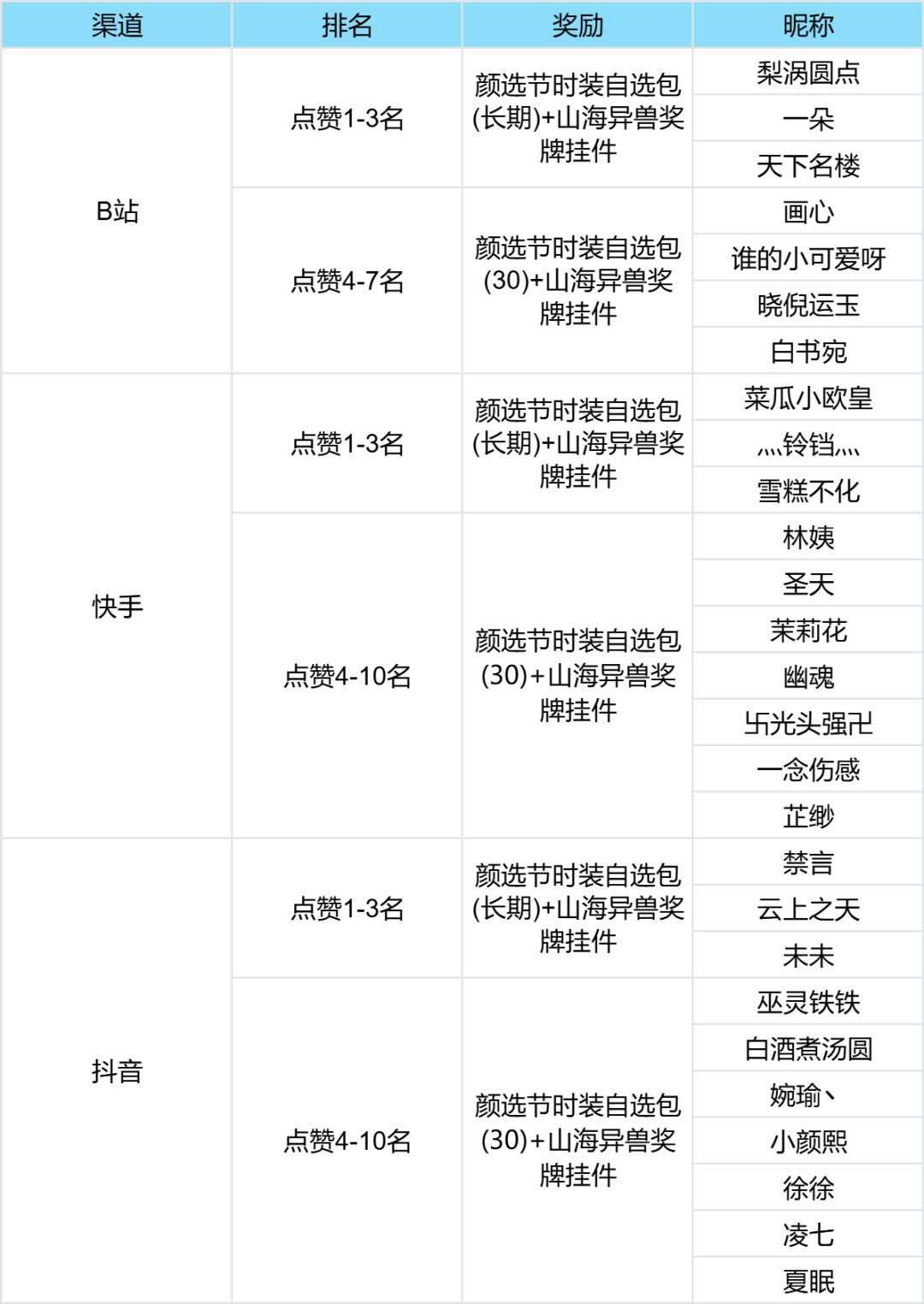恭喜以上在抖音、B站、快手平台脱颖而出的旅者获得专属的颜选节时装及“山海异兽奖牌”周边奖励!