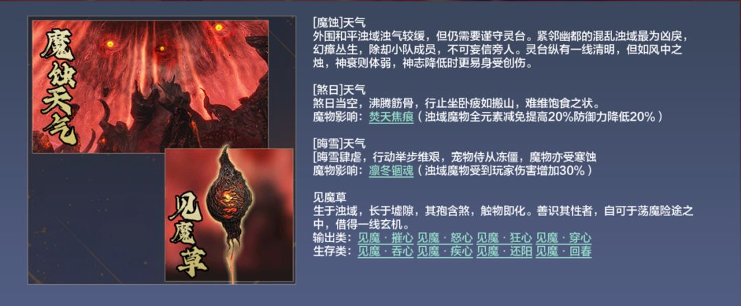 [魔蚀]天气:距离北海中心幽都较远的区域,受魔气影响较小,为和平浊域(不可攻击他人);而靠近幽都的区域为混乱浊域,除小队成员外皆为对立。进入浊域荡魔区域后,神志会持续流失(当神志降低到一定程度时,会持续流失血量);离开浊域后会慢慢恢复。