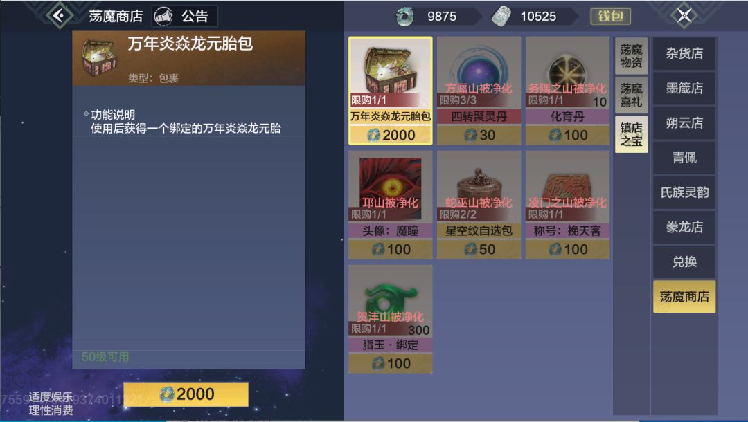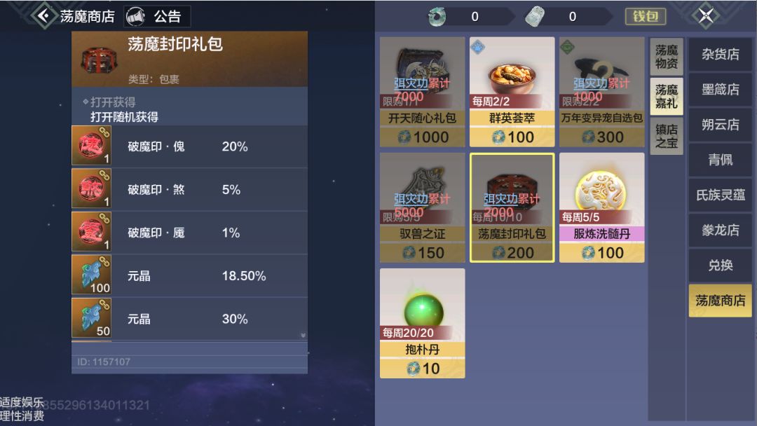 荡魔商店内准备了多重好礼,百战/千斩装备、荡魔封印礼包(随机获得破魔印、万年及以上破元印)、星空纹自选包、万年炎焱龙元胎包、开天随心礼包、万年变异宠自选包、驭兽之证、群英荟萃等。