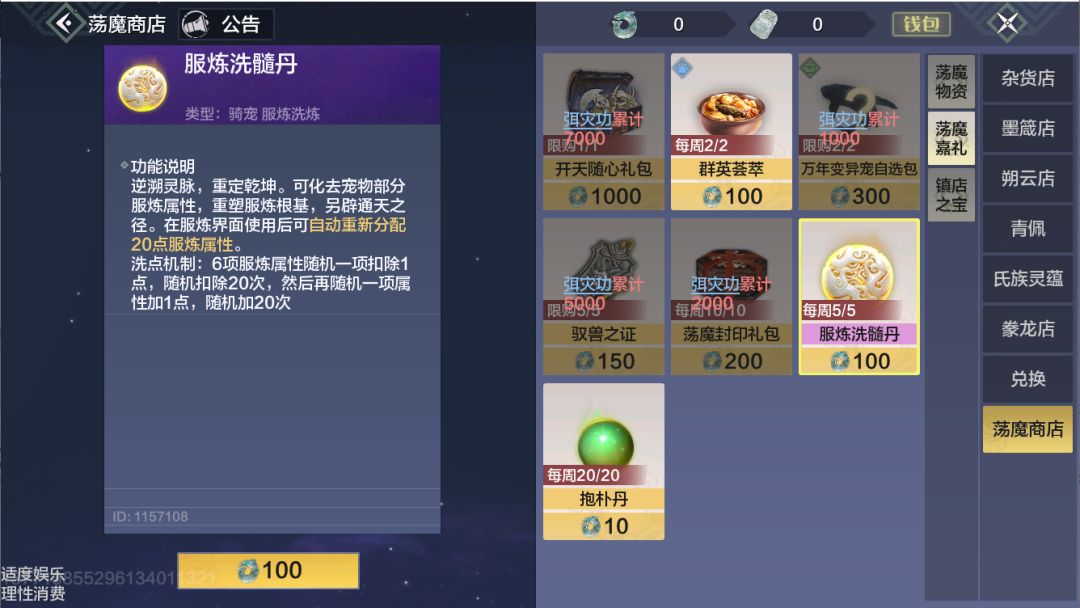 此外,荡魔商店还新上线了全新骑宠服炼洗炼道具——服炼洗髓丹,使用后可洗炼骑宠的服炼点数。点击服炼界面【服炼属性点】旁的重置按钮,即可使用服炼洗髓丹,使用洗髓丹后,将会自动重新分配20点服炼属性,旅者可选择是否保留洗炼结果(无论是否保留,都会消耗服炼洗髓丹)。