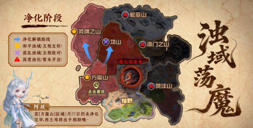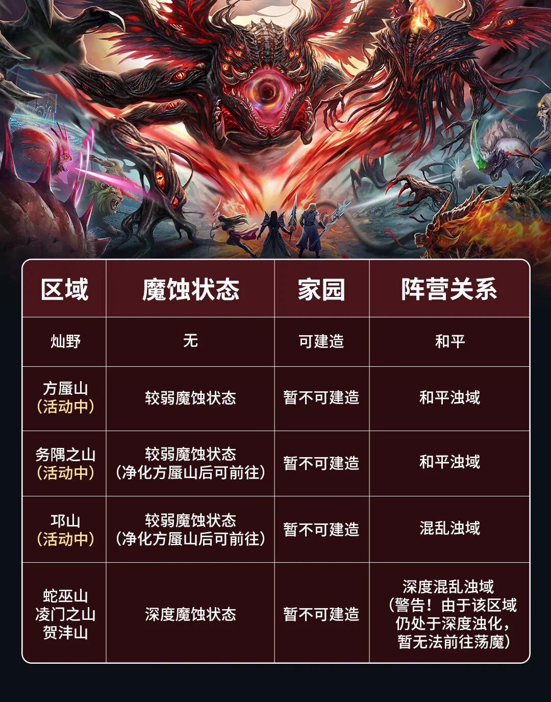 目前仅【灿野】区域为安全区,方蜃山、务隅之山、邛山魔蚀较弱,将开放浊域荡魔玩法,而蛇巫山、凌门之山、贺沣山目前魔蚀较强,暂无法前往推进,后续随时间魔蚀减弱后将开放。