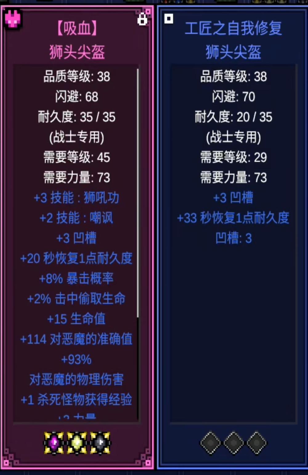 - 两把自修投掷武器(其中一把最好带加深),西金两件高额攻速吸血,焚烧项链提升火抗和火抗上限,迈克提升技能等级(无迈克用火抗+视野戒指),黄戒指补视野和吸蓝,宠物优先最大和生命值,鞋子补移速(没有的话用抗性+视野),战士自修头(3颗物理最大宝珠),甲的话有自修就打物理最大,没有的话就随意(抗性血量金甲,密文财宝甲,机械甲),如果实在没有自修头甲,可以白天自己看着修一下(物理灰孔头甲)。