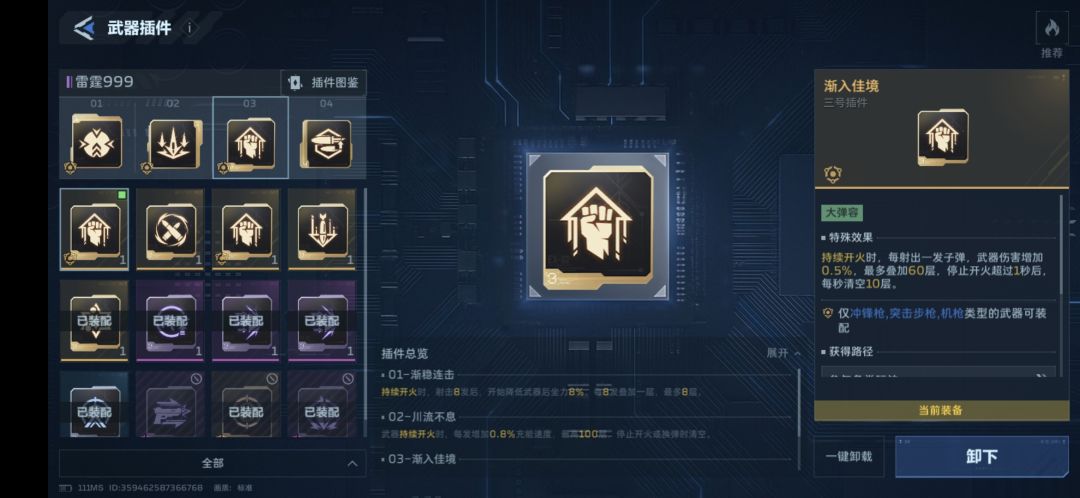 1号芯片位:我们可以带(渐入连击)可以大幅降低999的后坐力让输出更加稳,官方推荐的大弹夹就不需要了一点子弹都不提升,这把武器的被动就是上限999发子弹,所以吃不到弹夹加长,