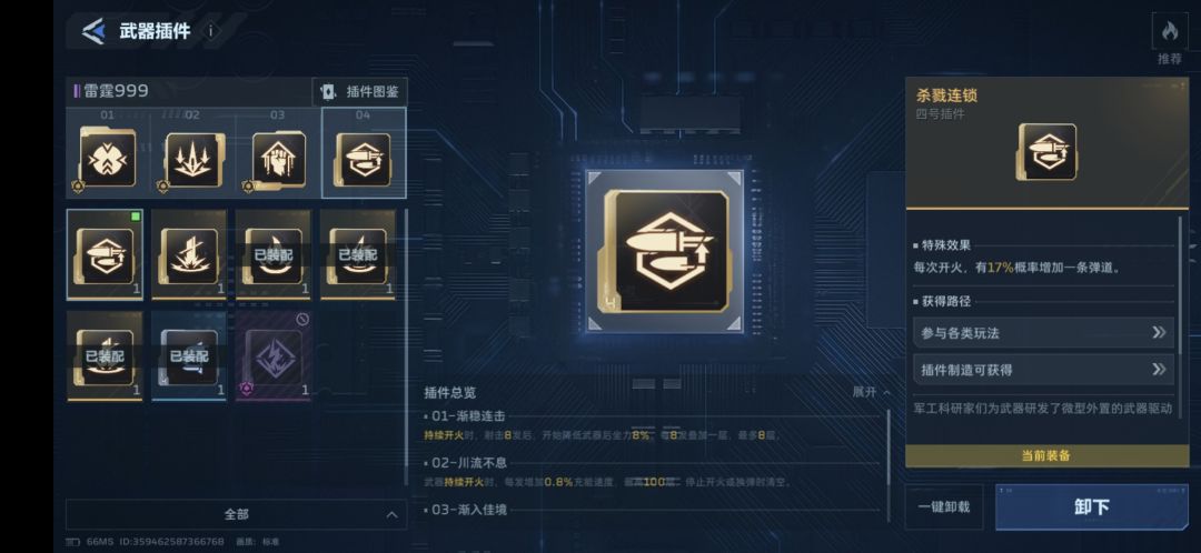 4号芯片位:这里有两种带法,一种是带(杀戮连锁)有百分之17概率增加一条弹道,也可以带(闪电轰击)每命中五枪,提升一次爆炸输出。OK攻略就推荐到这里了,谢谢观看,也欢迎补充