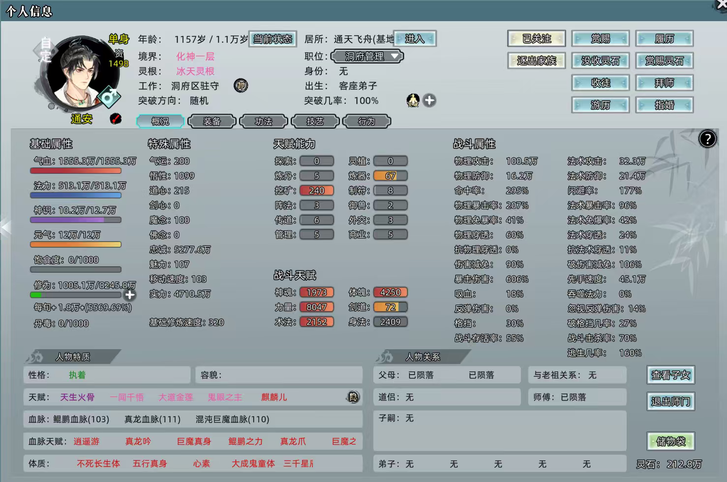 1,有毕业人物,满血脉,且化神1层。