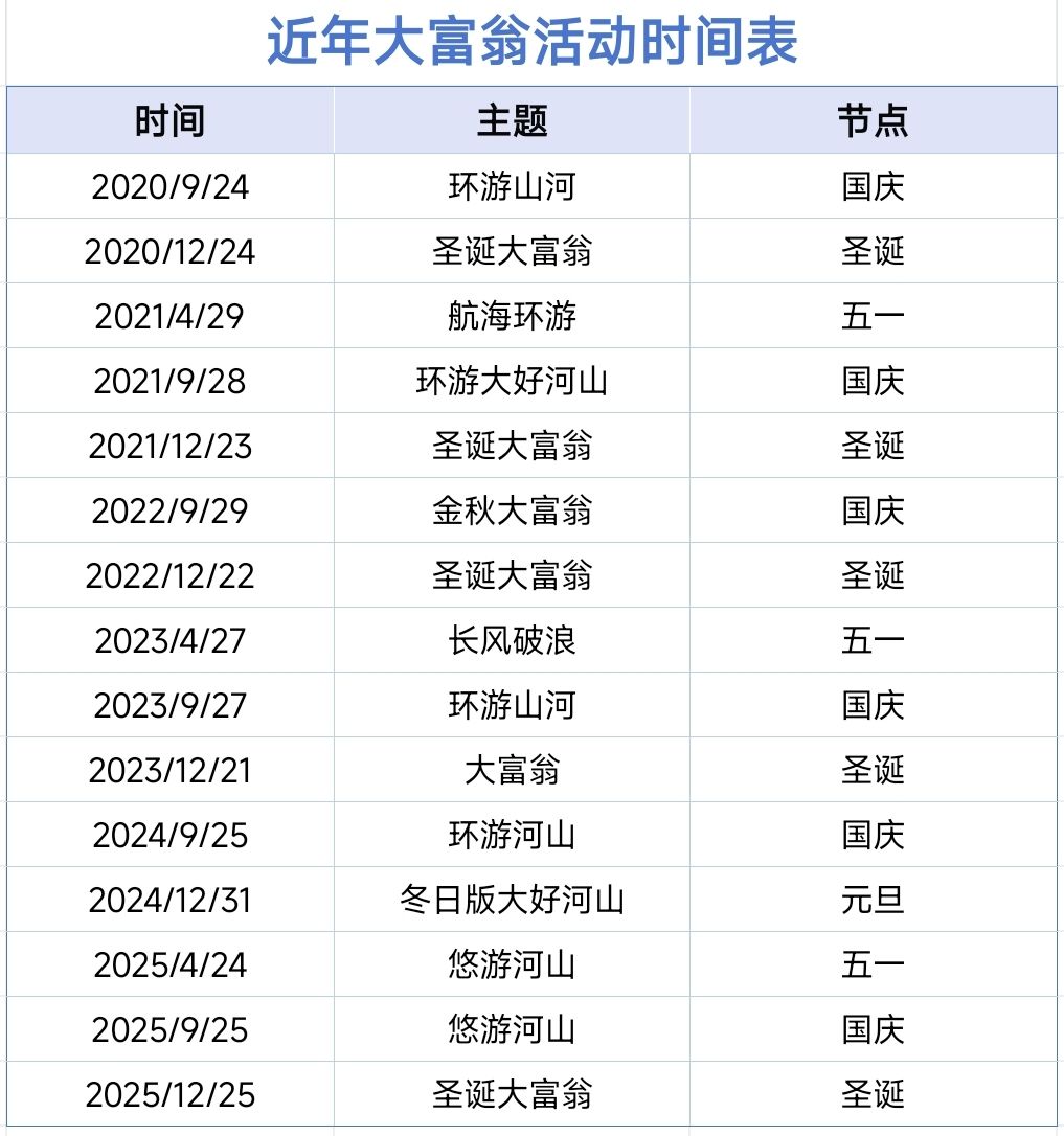 扒了近年几年的公告,得出上表,不难看出,大富翁一年最多只有三次,分别处于五一、国庆、双旦这三个节点。过年和周年庆还没有开大富翁的先例啦,所以过年期待其他的吧。