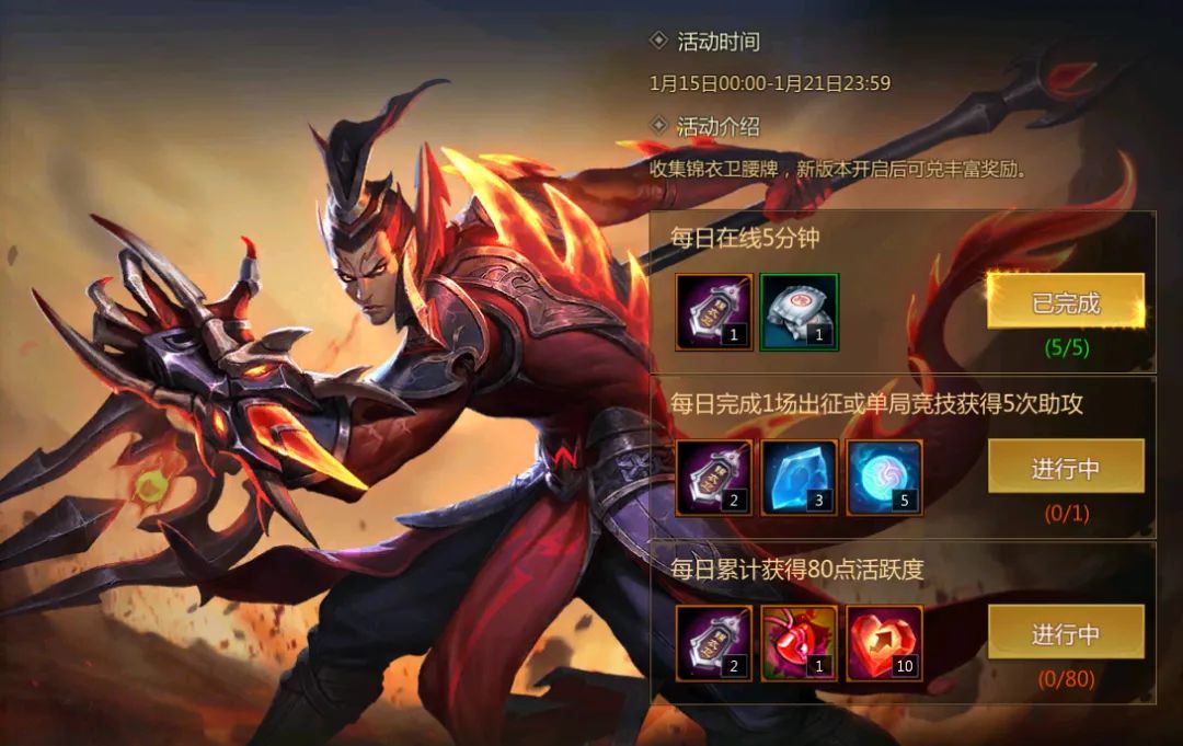 ●【每日】完成1场「出征」或单局竞技获得5次助攻可获得锦衣卫腰牌*2、封灵玉碎片*3、竞技之魂*5