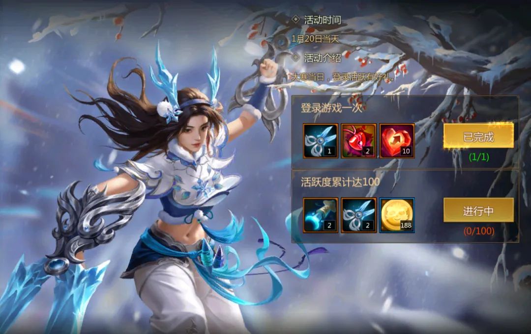 活动当天登录游戏一次,可获得玉光剪*1、橙色幸运符*2、活跃之心*10;活跃度累计100,可获得月之匙*2、玉光剪*2、绑定梦三币*188
