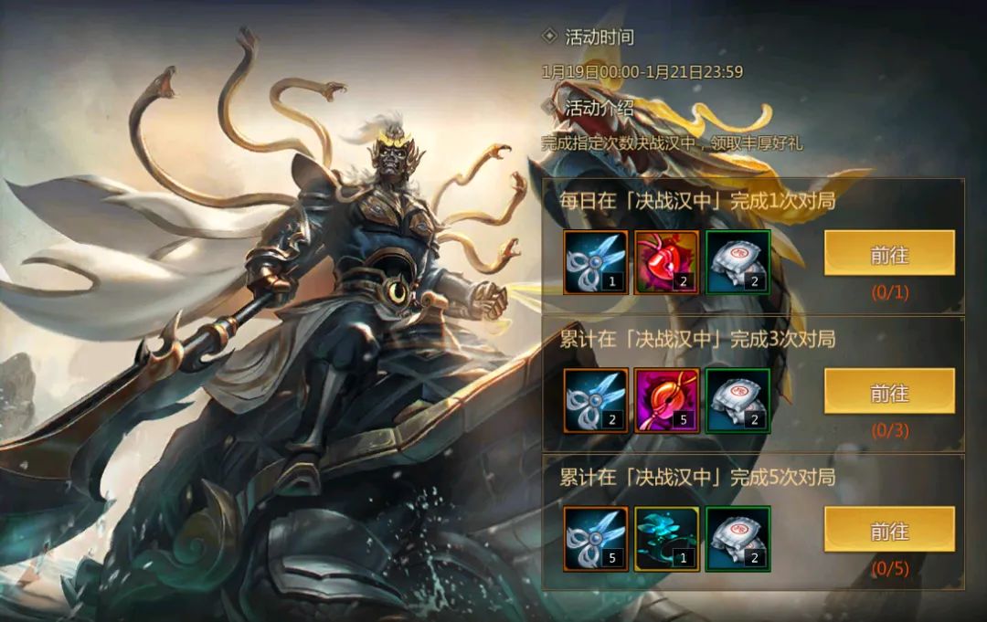 ●【每日】在「决战汉中」完成3次对局,可获得玉光剪*2、幸运玉佩*5、兵粮卡*2