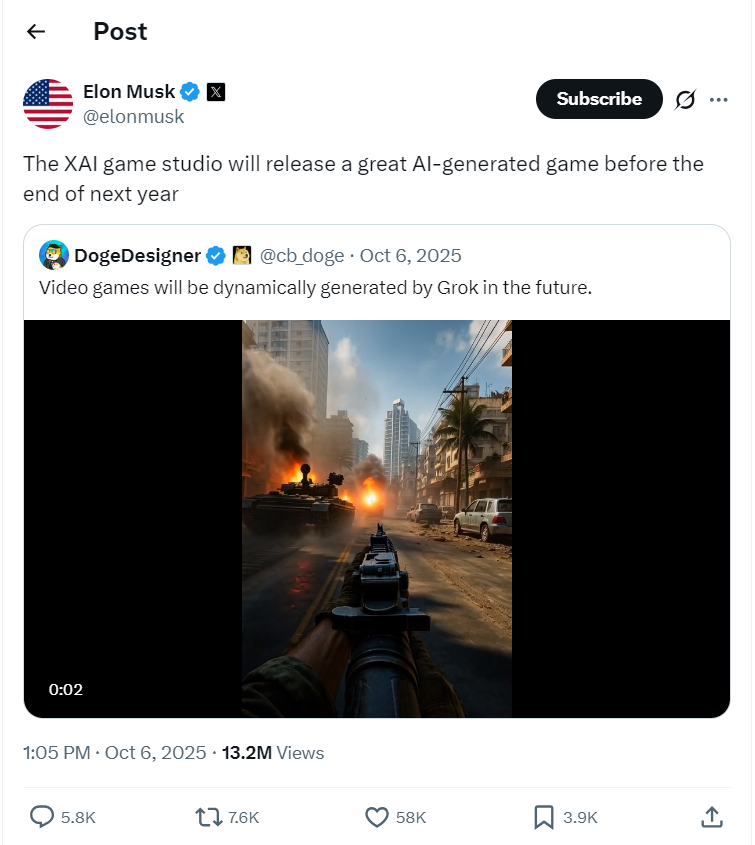 相对而言,科技界大佬们远比游戏创作者们更看好AI,埃隆·马斯克就宣称,旗下公司xAI会在2026年年底前推出一款“优秀的AI生成游戏”。英伟达CEO黄仁勋的预测更“保守”一点,说AI生成游戏会在5-10年内出现。