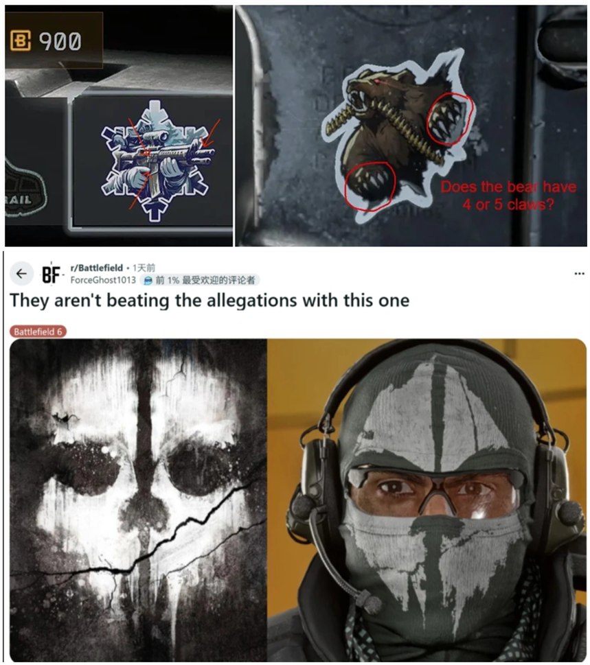 《战地风云6》也是此类问题的重灾区,用于售卖的道具、武器贴纸、角色皮肤等都受到过指摘,其中2025年年底的一款新皮肤被用户扒出,可能是用了十几年前发售的《使命召唤10》的素材作为AI提示词或底图,该游戏偏偏还在发售前曾承诺不会使用AI。