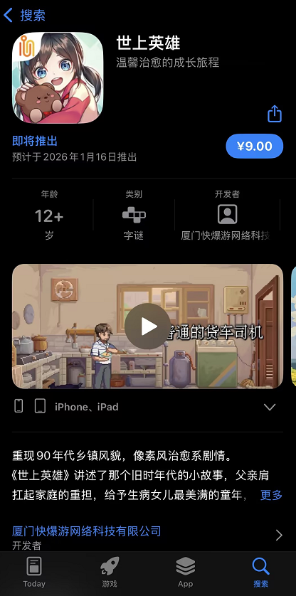 由良心工作室代理,温馨像素风剧情向游戏——Steam好评如潮的正版移植手游《世上英雄》将在26年1月16日上午10点在安卓和iOS双端正式与大家见面!