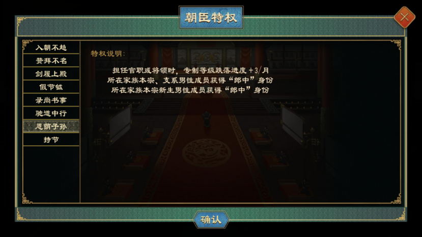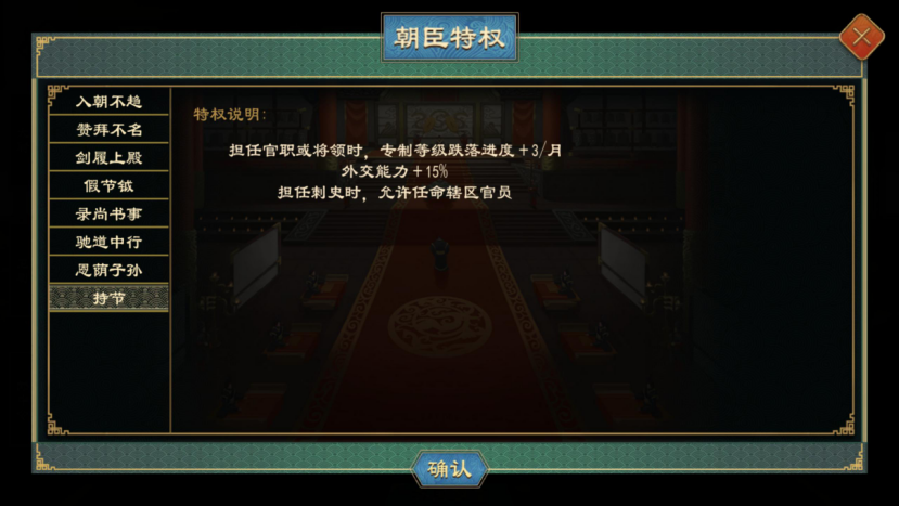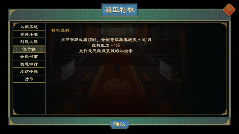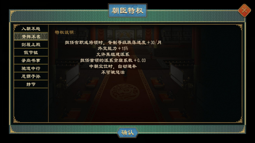 拥有入朝不趋、赞拜不名、剑履上殿特权的人物或获得相应的施政、外交、军事能力加成,且可以组建派系、在中朝存在空缺时会自动递补、无法被惩治。