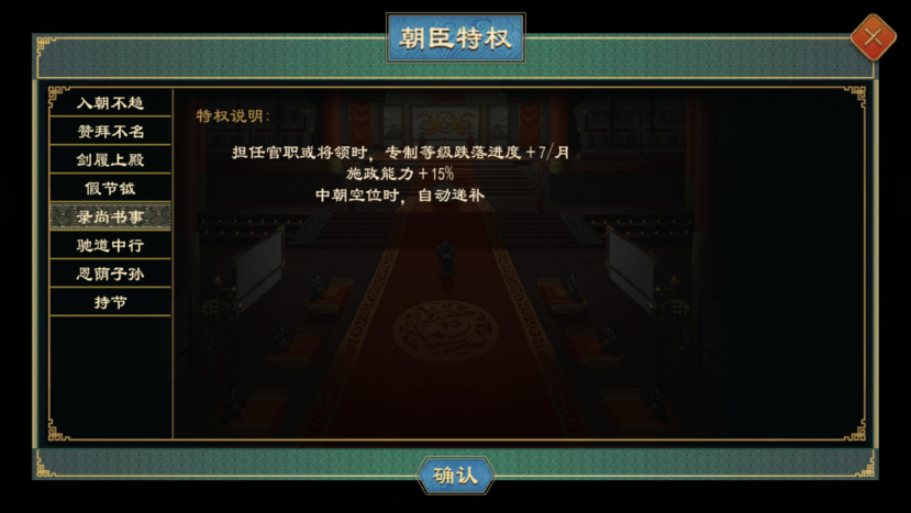 拥有录尚书事特权的人物施政能力+15%,在中朝存在空缺时会自动递补。