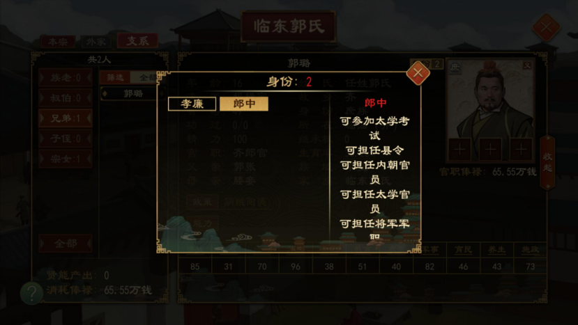 拥有恩荫子孙特权的人物,其家族的本宗、支系男性成员立刻获得“郎中”身份,所在家族本宗后续新生男性成员也将获得“郎中”身份。