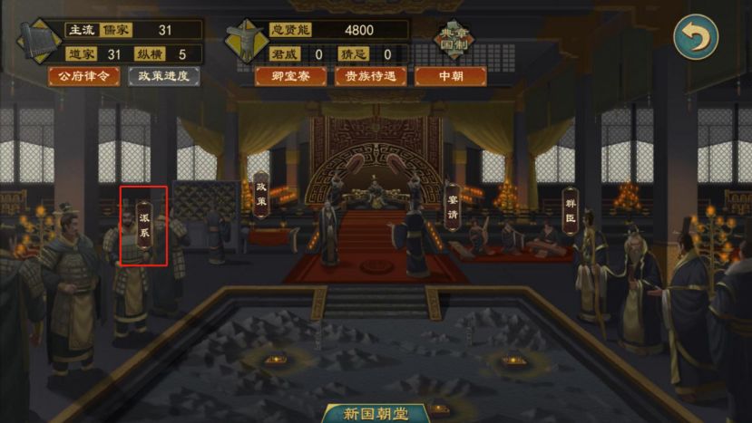 新版本派系分为“忠君派”“政见派”“谋身派” 三种。满足条件的朝臣可以组建派系。