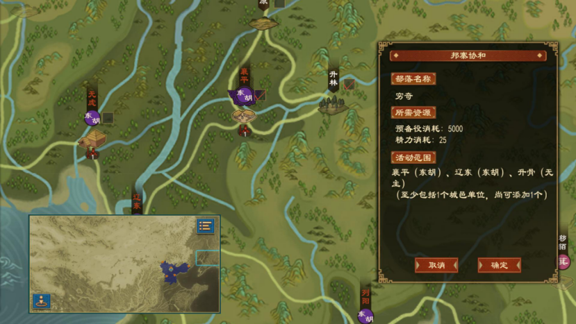 后羿使用邦寨协和能力后,可以在地图上指定最多四座彼此相邻的城邑,在这些城邑中组建一个同族域的戎狄部落并将关系提升至交好。