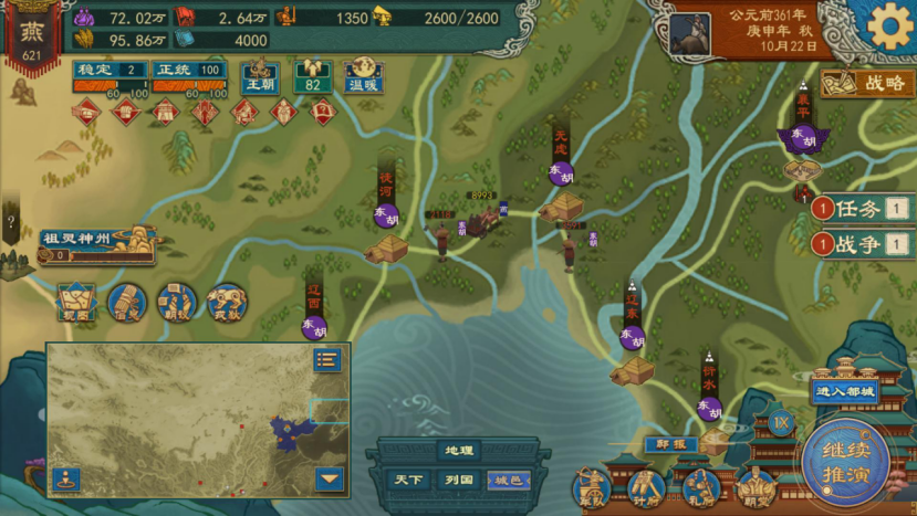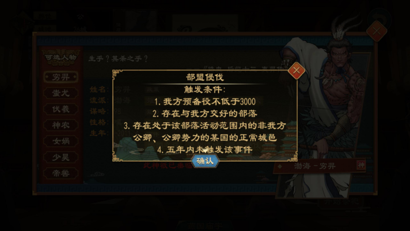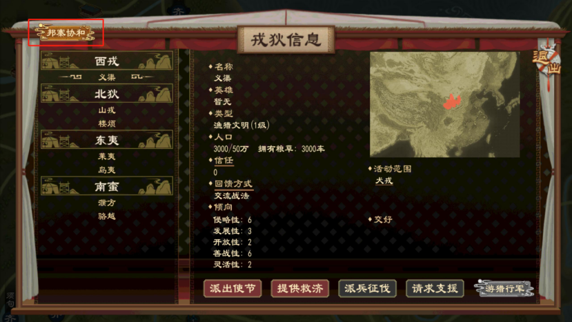 当本局游戏中我方交好的戎狄部落范围内,存在非公卿势力的某国正常城邑,则有概率发生部盟侵伐事件,将该城邑直接获得。