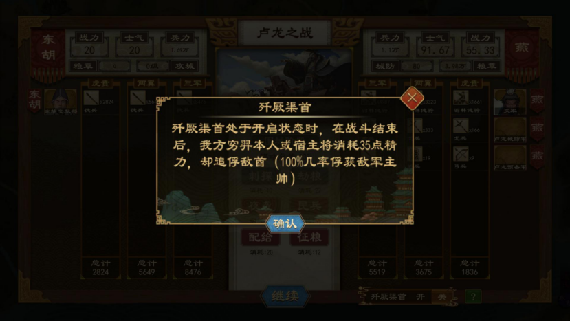 穷羿自身或垂临对象担任远征军将领参与遭遇战、野战与攻城战时,若敌军拥有主帅,则可以在右下角歼厥渠首开关中选择是否开启;开启并取得胜利后,可以100%俘虏敌军将领。