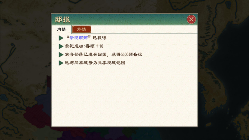 当本局游戏中我方交好的戎狄部落范围内,有我方派遣了细作且情报网低于100%的1级势力,则有概率发生盟邦谍候事件,将我方在该势力的情报网提升到100%。