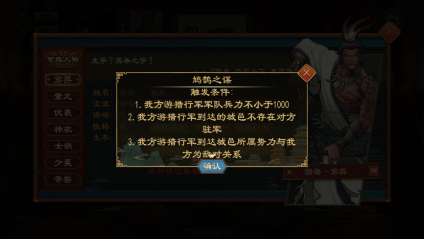 穷羿可以触发三个特殊事件:鸠鹊之谋、盟邦谍候、部盟侵伐。