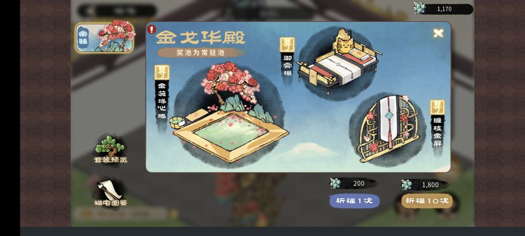 最后简单说一下猫话创新的“猫宅”系统,府邸一定等级开启,需要攒特殊代币抽家具(月卡给一点,每日在庭院领一次),布置自己的家(家具古风好评)。布置猫宅给一定的属性加成。