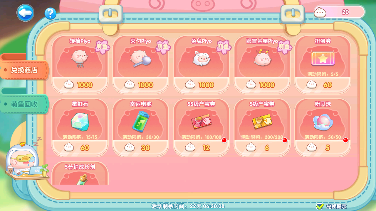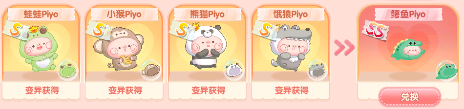 兔兔Piyo可变异出S级蛙蛙Piyo、小猴Piyo、熊猫Piyo、饿狼Piyo,它们的鱼宝可以兑换SS级鳄鱼Piyo;
