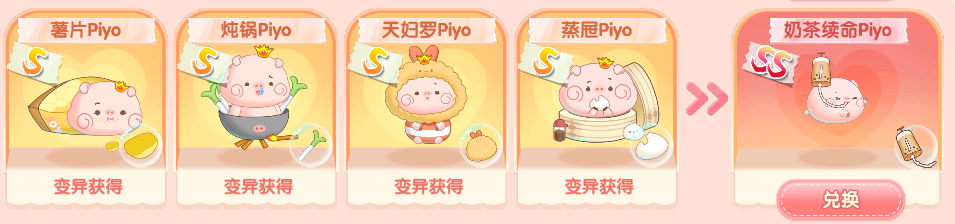 来勺Piyo可变异出S级薯片Piyo、炖锅Piyo、天妇罗Piyo、蒸屉Piyo,它们的鱼宝可以兑换SS级奶茶续命Piyo;