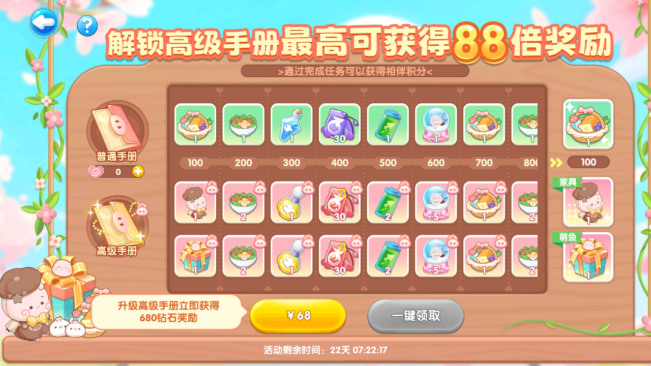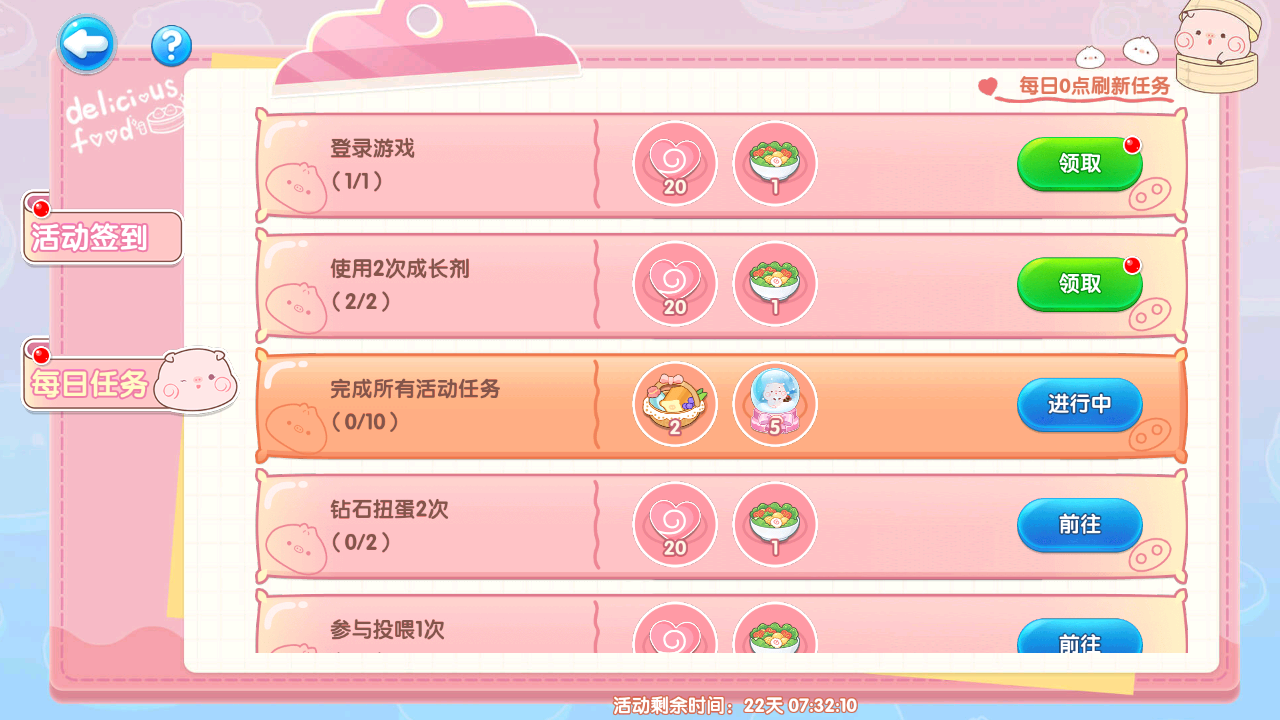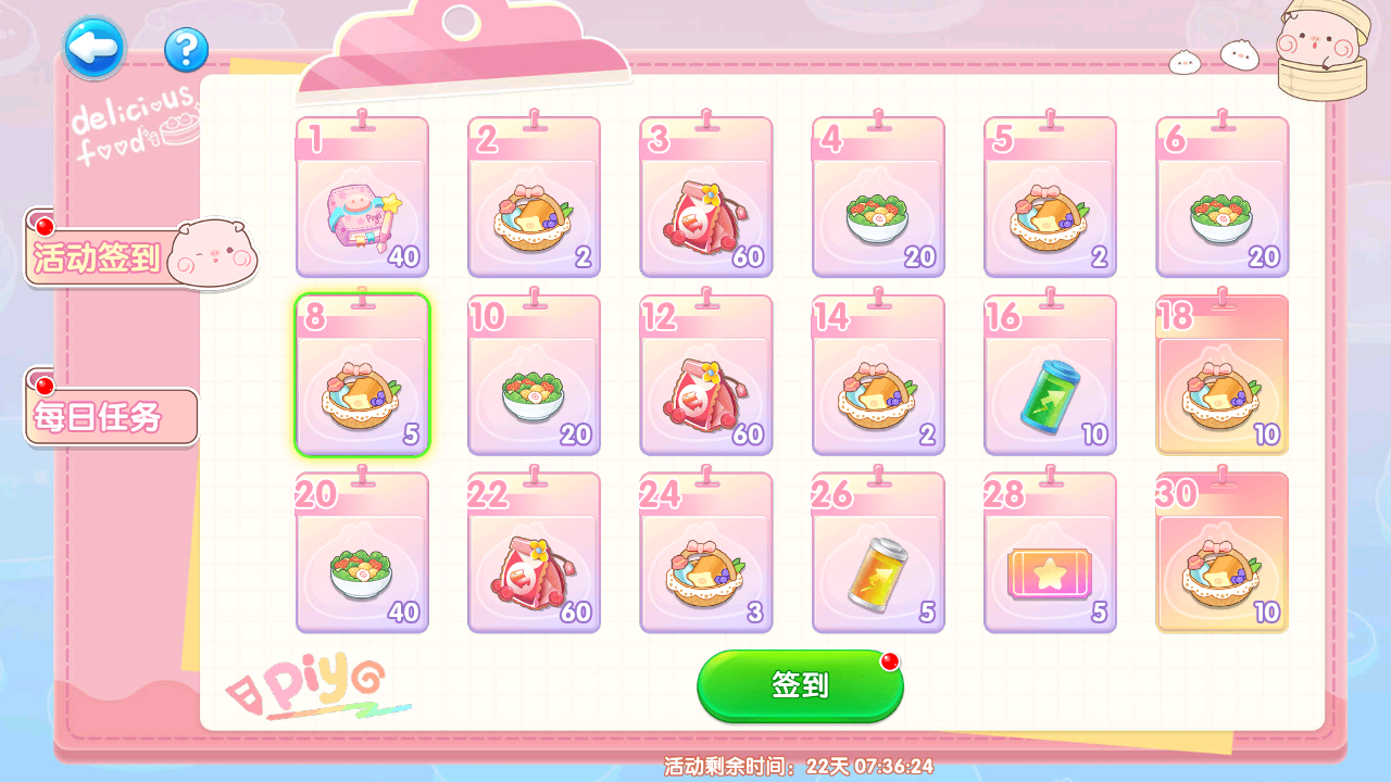 按时参与活动签到即可直接领取限时活动道具,Piyo的幸福秘诀(用于SSS级鱼合体),野餐篮(Piyo野筳之约抽奖)、什锦蔬菜(用于投喂助力)直接到手!