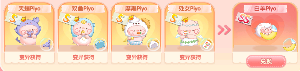 眼冒金星Piyo可变异出S级天蝎Piyo、双鱼Piyo、摩羯Piyo、处女Piyo,它们的鱼宝可以兑换SS级白羊Piyo;