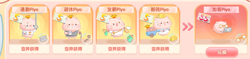 转椅Piyo可变异出S级通勤Piyo、退休Piyo、发薪Piyo、搬砖Piyo,它们的鱼宝可以兑换SS级加班Piyo;