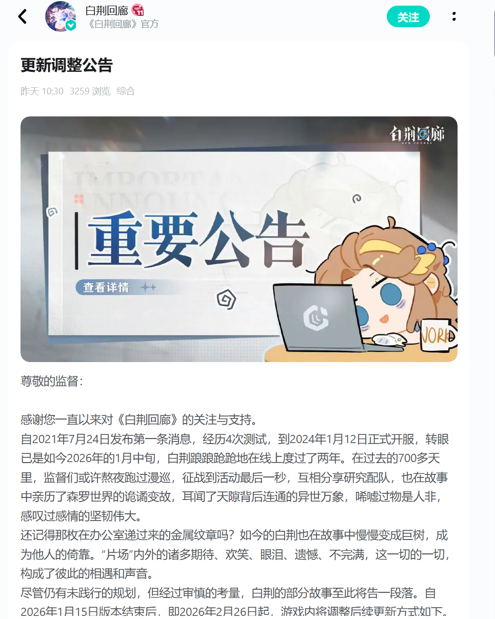 《白荆回廊》官方宣布停止周期性内容更新 将转入维护模式