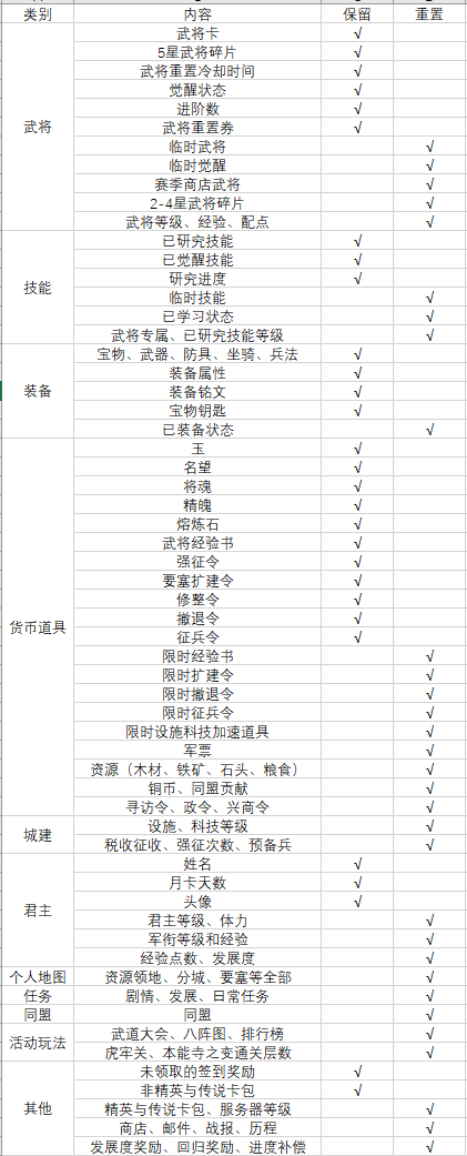 2.对君主在设施、科技、武将等养成方面(全新赛季重置部分)进行结算,如: