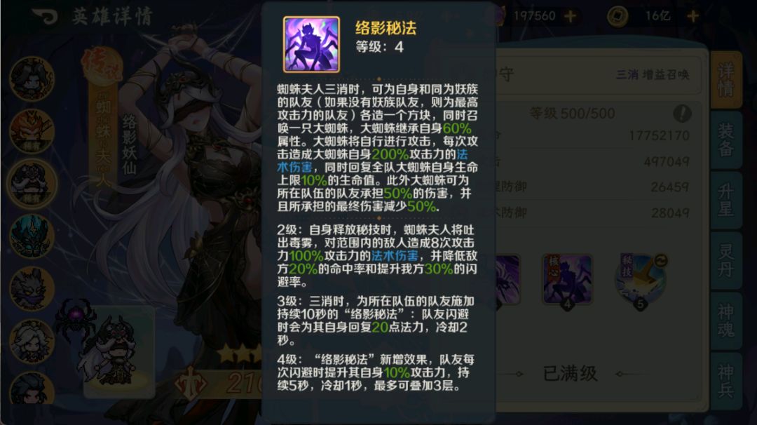 可以看出蜘蛛夫人在两队一起打boss的环境下是甩开九尾狐很远的,最关键就是来自她核心技能的造块能为自己与孙悟空稳定造块使得孙悟空能稳定触发追击技,不会像携带其他三消角色遇到卡块的情况,核心技造两个块的高产也是大大提升了阎罗的输出。在星级升到4星解锁3级核心技时个人认为是最强的一个阶段,高频率的三消无视技能冷却,达到与回蓝圣物同样的数值,孙悟空与阎罗秘技的增益buff可以说是不间断的,在达到6+2时就是完全体了