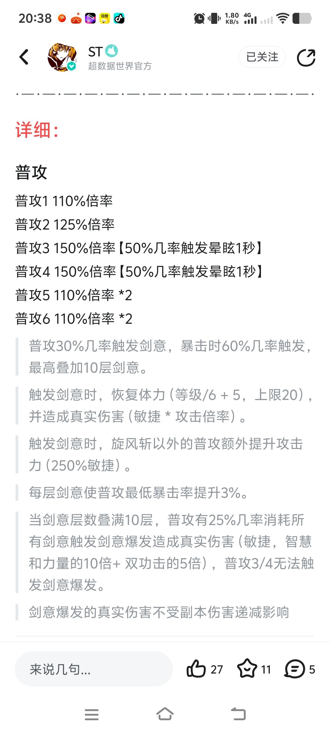 正常情况30%触发,暴击后60%触发剑意。叠到十层剑意下一击(25%触发)剑意爆发伤害也就是真伤数值。