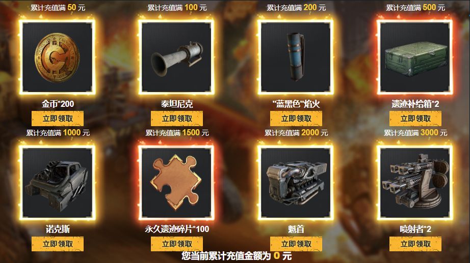 | 活动期间,累计充值金额达到指定要求,即可领取对应回馈奖励。