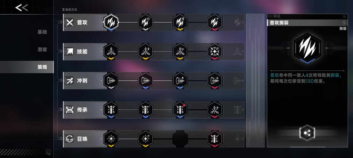 基础策略构筑为:普攻撕裂/技能影链/冲刺飞剑/传承技电桩/召唤光阵