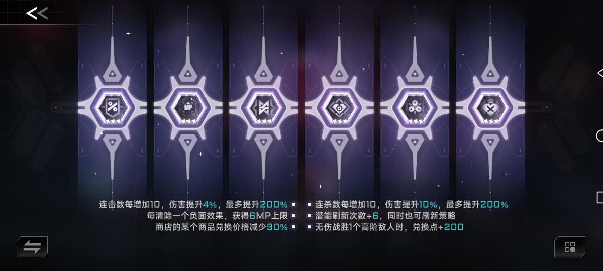 无伤击败高阶敌人获得200点兑换:无伤击败高阶敌人本身就有奖励机制,清除所有负面,并获得一个正面效果,在终极战斗之前,总共有,一到四图,一个boss,阿尔法空间可以打雷姬,跟两个获得潜能的boss,也就是总共七个都无伤的话,就是1400兑换点,如果对自己手法自信的话,这个是必带的,兑换点才是这个游戏最重要的资源(如果对自己手法不自信,可以换成死里逃生哦)