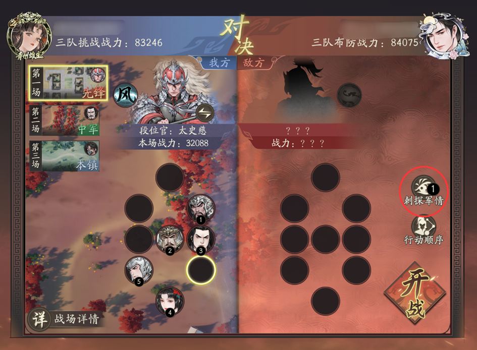 进攻配队及布局,可随时通过左下【战场详情】按钮进行调整。根据刺探出的对手场次布局,可以大致推测出对方是否将主力安排在该场次内。故可采用田忌赛马战略,以自身最弱队伍消耗对手最强阵容,从而尽量达成2胜1负的总战局胜出结果。