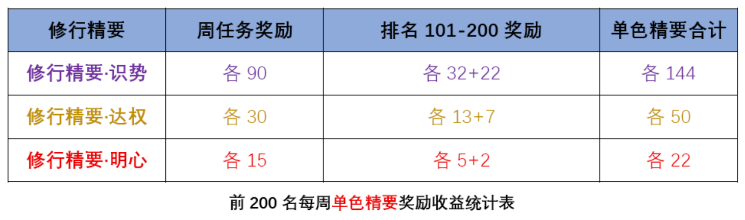 综合服务器情况及每周达成周任务600难度分门槛,预测在排行奖励中可获得前200名,至少可以获取单色性格精要如上表,是副将养成材料产出大头。建议玩家至少每周完成周任务以获取养成材料。