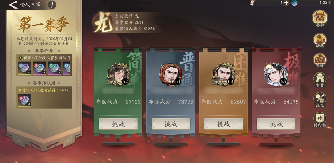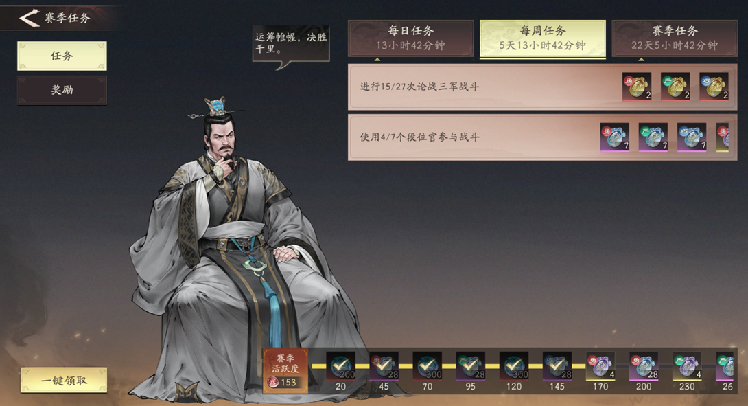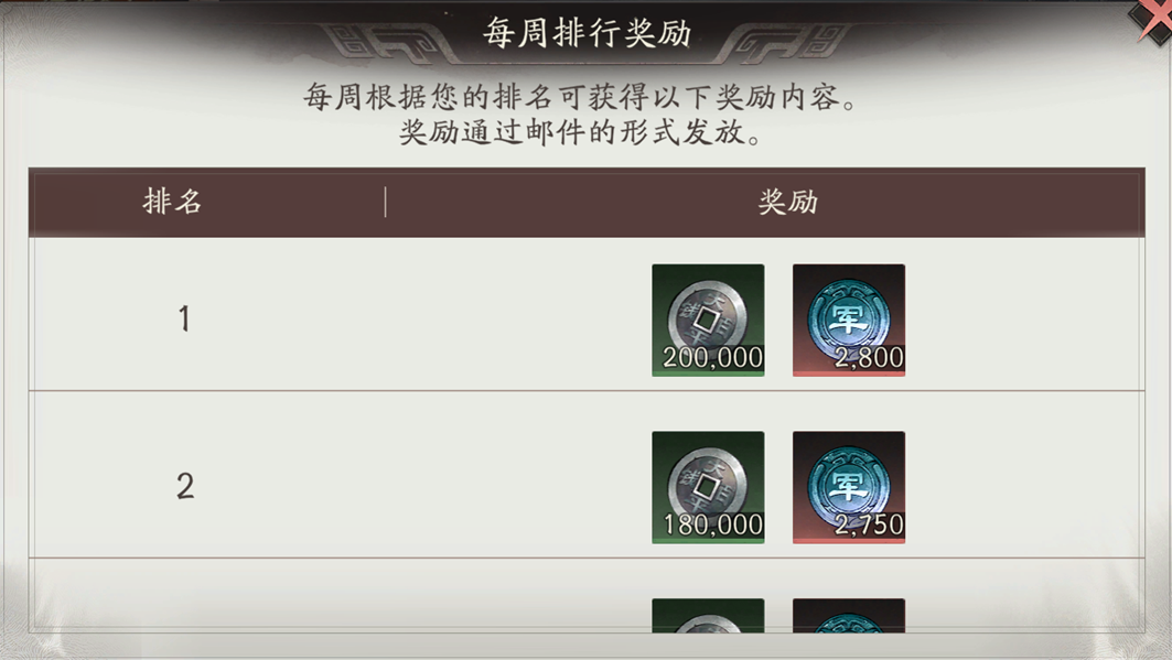 积分累积后会显示服务器排名,周排名会在每周一凌晨6点结算奖励,赛季排名在赛季开始后第28天的周三22点结算,均与群雄逐鹿结算机制一致。其中周结算给予的玩法货币【三军令】是玩法内获得该货币的大头,但排名前200的每个档次差距仅50币,101-200名与第1名每周仅差距300货币。推荐玩家参与该玩法的同时尽量将自身排名保持在200名之内,防守输了不减分,进攻极难实际为同战力对手,赢了至少得80分,尽量用保2弃1战术赢下对局。体感只要认真参与,维持200名之内不难。