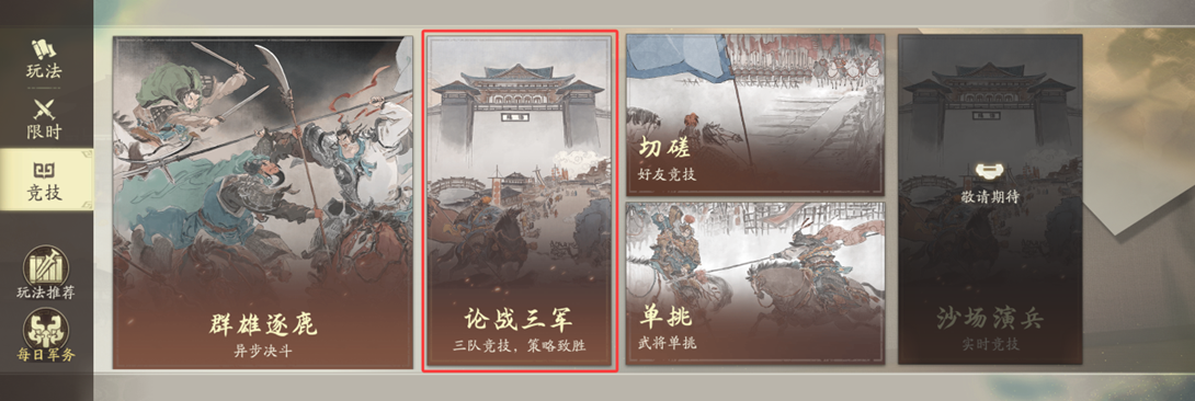 论战三军是本次版本新增的一大PVP玩法,可以从【竞技】标签点选进入,同样属于赛季制常驻玩法。