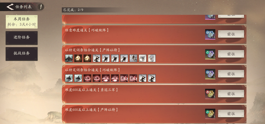 玩法对应有每周任务、进阶任务及挑战任务供玩家分难度分阶段挑战。其中每周任务为限时挑战任务,跟着玩法结算周期刷新,而非自然周刷新。进阶任务和挑战任务为一次性常驻挑战,没有时间限制,普通玩家当前养成若无法通关,可待后续养成逐步提升及主将新增后再进行挑战。