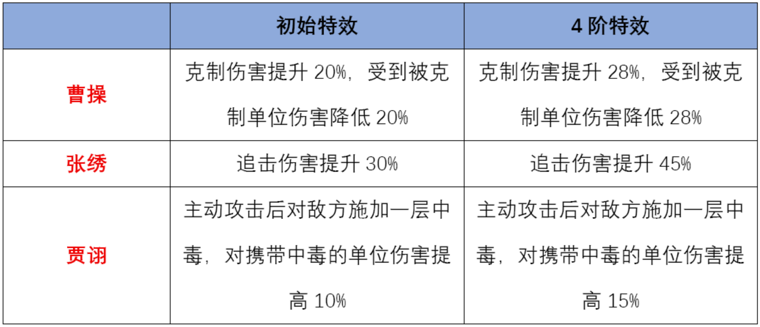 随着玩法更新,PVP玩法新增三位可用段位官,且最高可提升至5阶。其中曹操通用度高,但实际作用视对方配队,加成不稳定,暂时拉2阶提升统御值即可。张绣则非常适配枪兵追击队,使于禁+张飞+牵招类队伍作战时提升稳定,枪兵追击队阵容齐全的玩家可拉5阶。贾诩适配以贾诩为首的策士队,加速叠毒加快贾诩毒爆,在高血量高防御的长回合对局中十分好用,推荐优先拉满5阶。