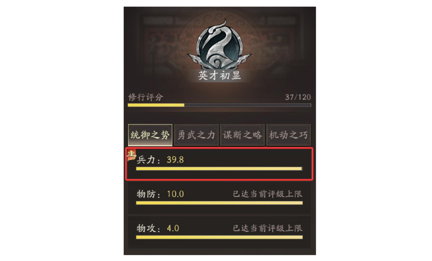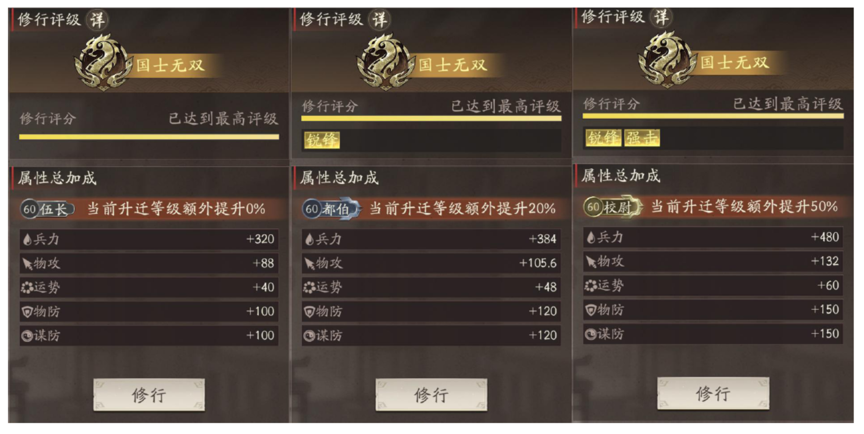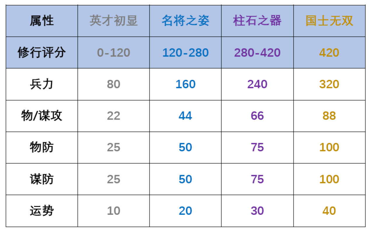 评分达到上线后,会提升修行评级,共分4级,英才初显→名将之资→柱石之器→国士无双。每次修行评级提升,都能使属性上限在英才初显基础上再提升1倍。同时副将韬略也随之提升,最高达到初始韬略属性的2倍。