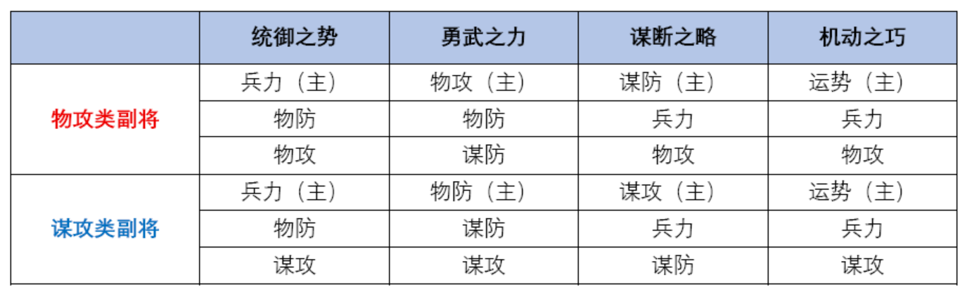 2大类副将修行的4个方向固定为:统御、勇武、谋断、机巧,细分属性区别如上表。