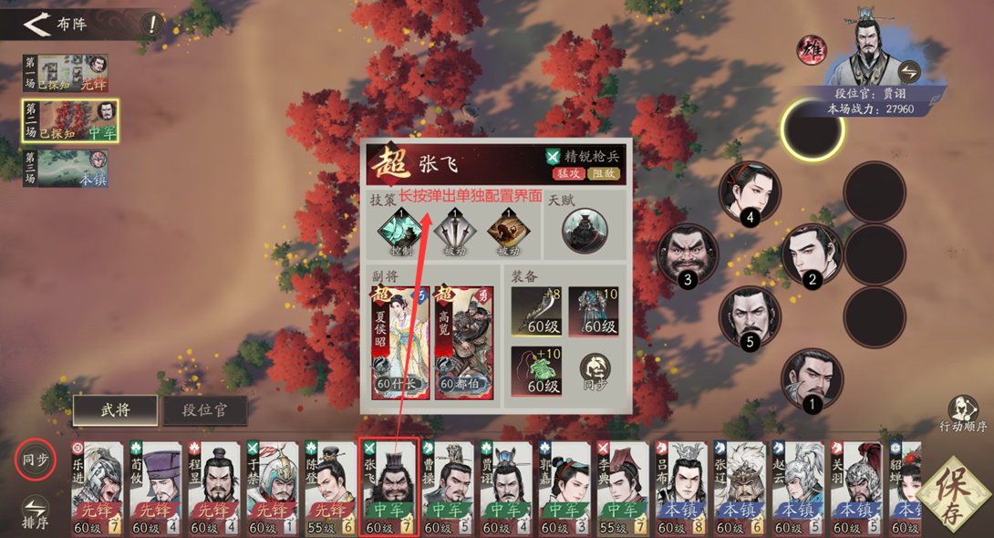 主将配装在玩法内可独立保存,不被玩法外配装替换更改所影响。可通过左侧【同步】按钮一键将玩法外配装一次性同步至玩法内,然后长按下方单独主将头像,微调技能与配装。